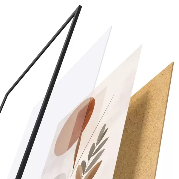 De poster bestaat uit een frame, plexiglas, geprinte afbeelding en spaanplaat achterkant. De poster kan meteen aan de muur worden gehangen dankzij de bevestigingen op de achterkant.