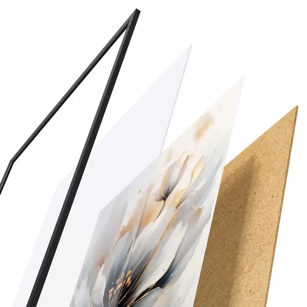 De poster bestaat uit een frame, plexiglas, geprinte afbeelding en spaanplaat achterkant. De poster kan meteen aan de muur worden gehangen dankzij de bevestigingen op de achterkant.