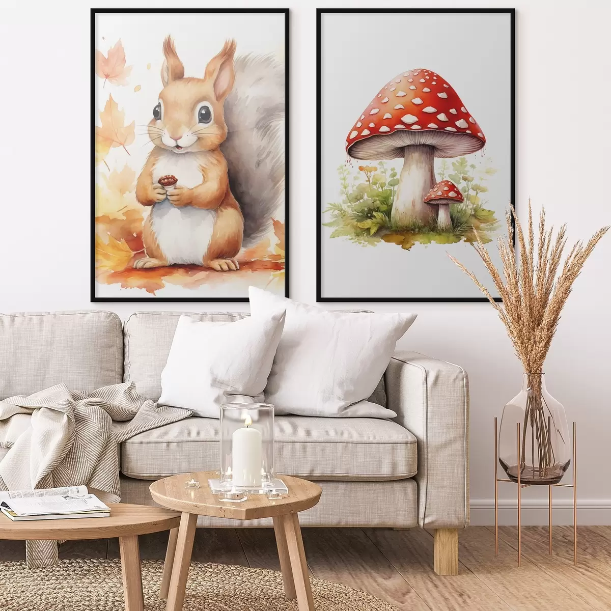 Poster Eekhoorn en bospaddenstoel, vliegenzwam, imitatie-aquarel Nr d01049