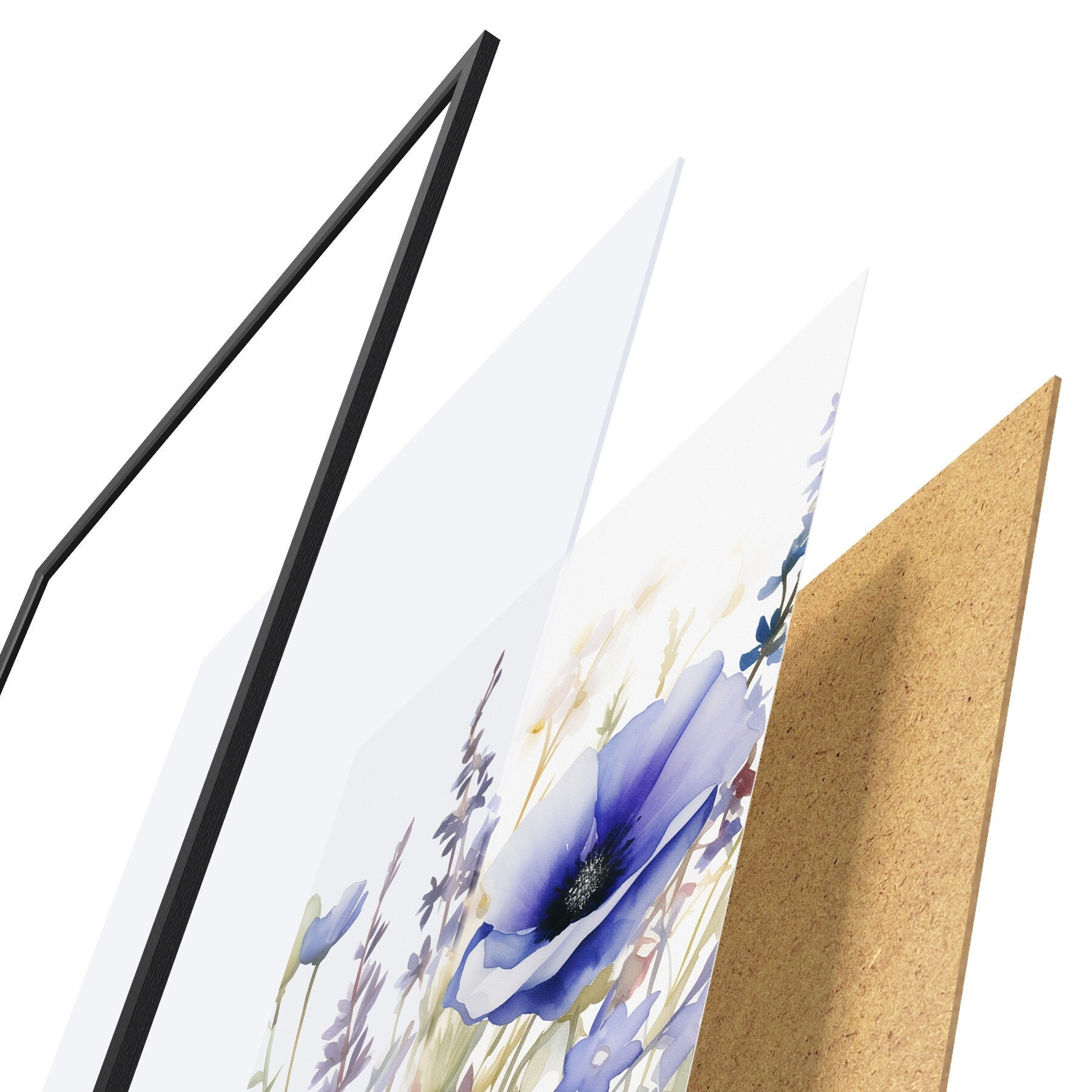 De poster bestaat uit een frame, plexiglas, geprinte afbeelding en spaanplaat achterkant. De poster kan meteen aan de muur worden gehangen dankzij de bevestigingen op de achterkant.