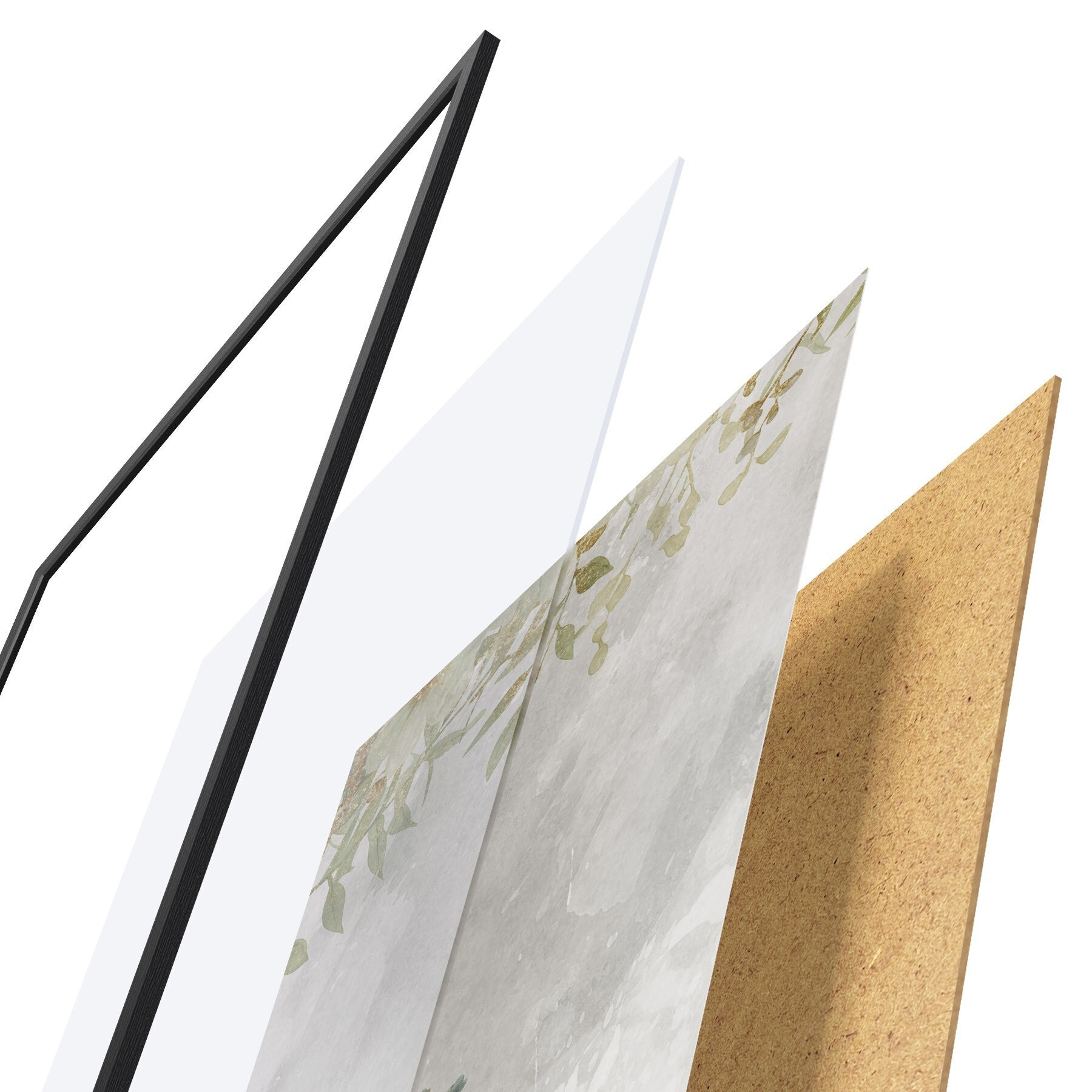 De poster bestaat uit een frame, plexiglas, geprinte afbeelding en spaanplaat achterkant. De poster kan meteen aan de muur worden gehangen dankzij de bevestigingen op de achterkant.
