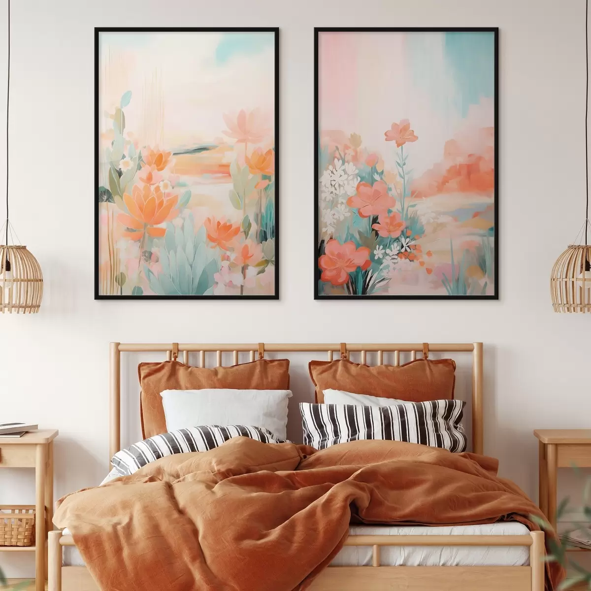 Poster Bloemmotieven in pasteltinten tegen de achtergrond van een licht mistige vallei Nr d01085