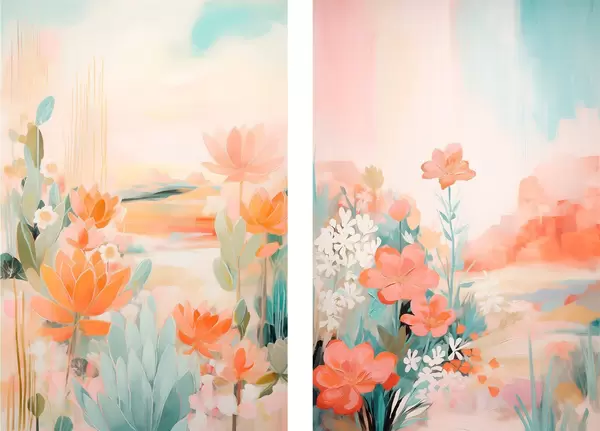 Poster Bloemmotieven in pasteltinten tegen de achtergrond van een licht mistige vallei Nr d01085