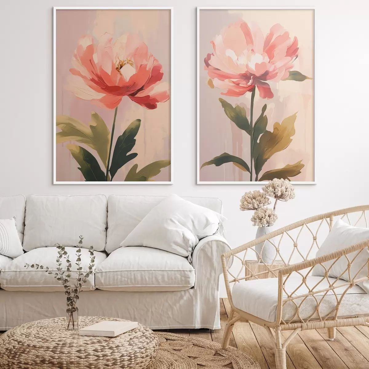 Poster Pastelkleurige pioenrozen op lange stelen in warme roze tinten d01093