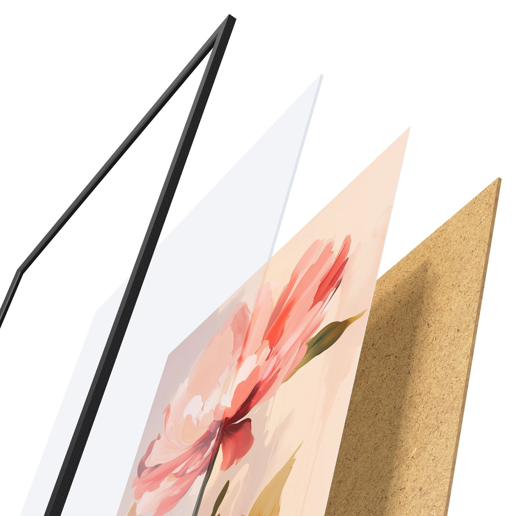 De poster bestaat uit een frame, plexiglas, geprinte afbeelding en spaanplaat achterkant. De poster kan meteen aan de muur worden gehangen dankzij de bevestigingen op de achterkant.