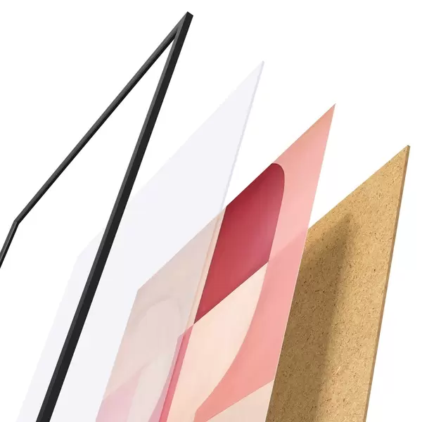 De poster bestaat uit een frame, plexiglas, geprinte afbeelding en spaanplaat achterkant. De poster kan meteen aan de muur worden gehangen dankzij de bevestigingen op de achterkant.