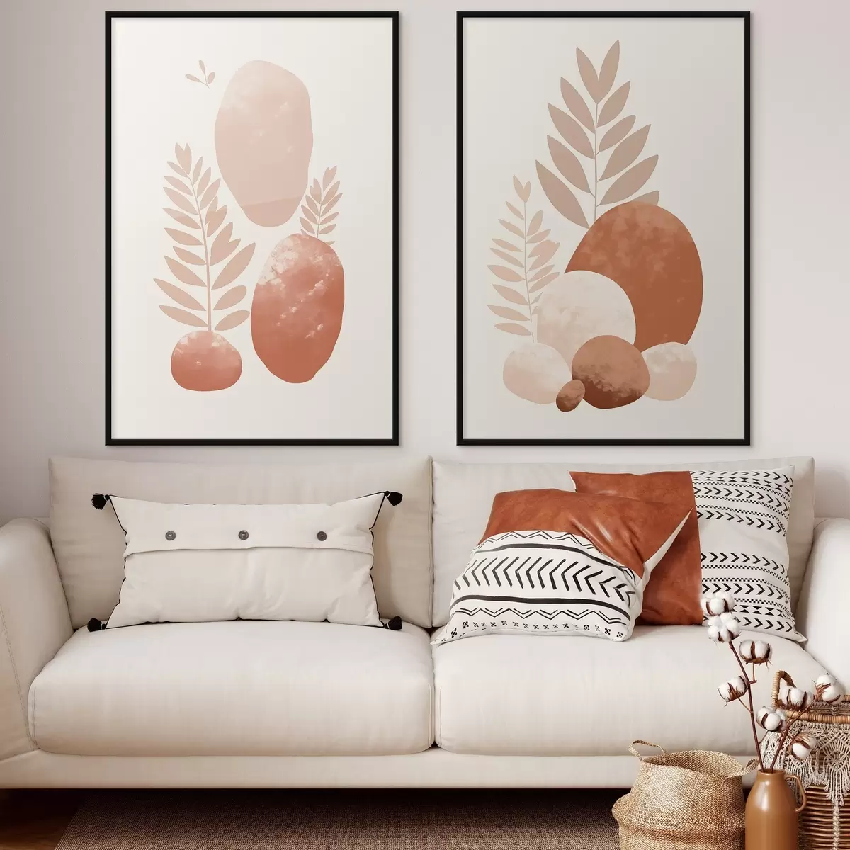 Poster Abstracte vormen, gestructureerde stenen en bladeren in gedempte perzik- en terracottatinten, minimalistisch, crèmekleurige achtergrond Nr d01114