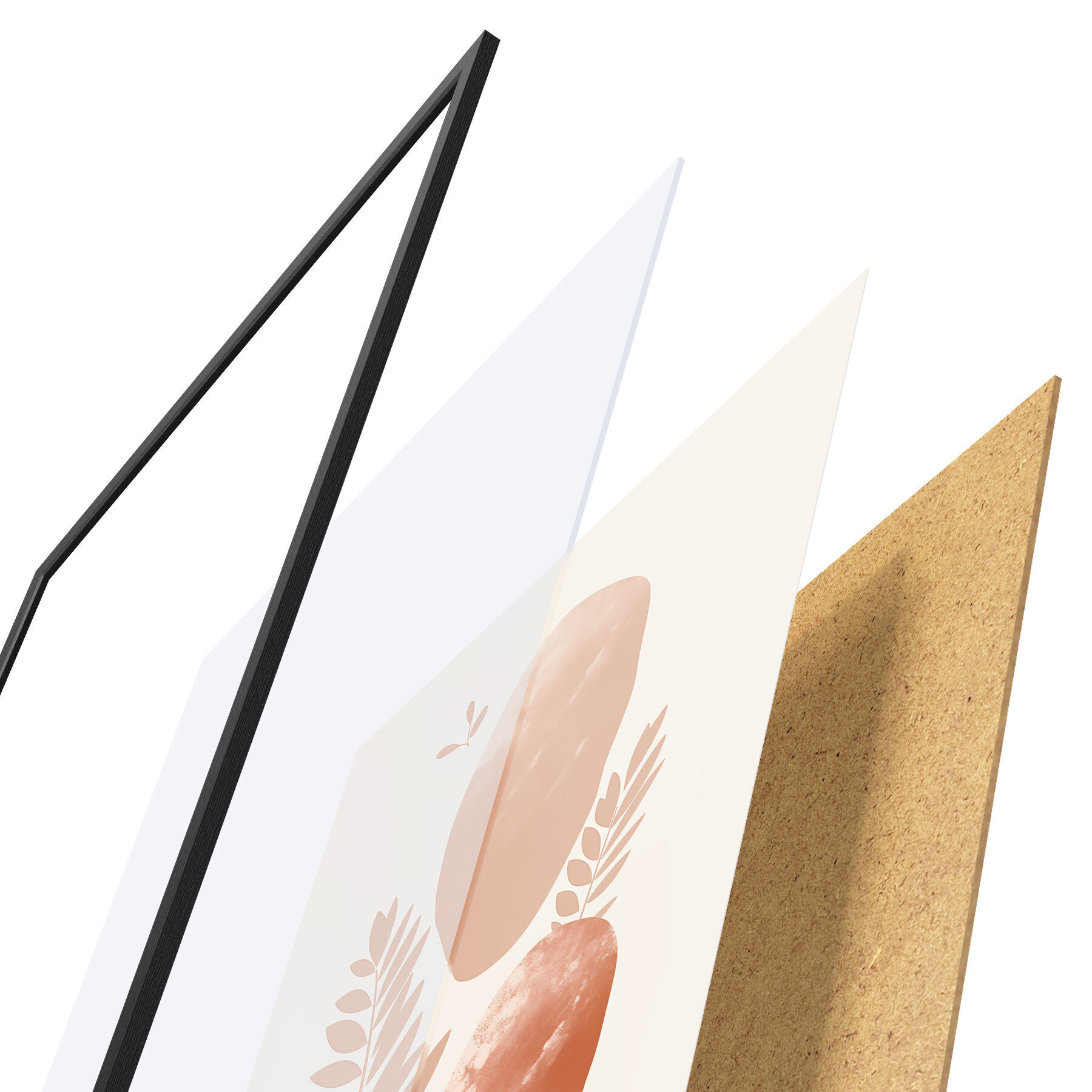 De poster bestaat uit een frame, plexiglas, geprinte afbeelding en spaanplaat achterkant. De poster kan meteen aan de muur worden gehangen dankzij de bevestigingen op de achterkant.