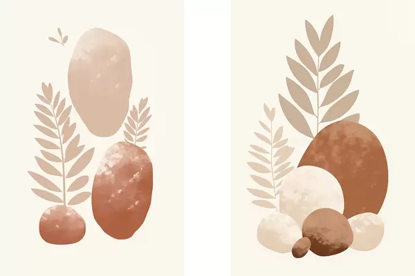 Poster Abstracte vormen, gestructureerde stenen en bladeren in gedempte perzik- en terracottatinten, minimalistisch, crèmekleurige achtergrond Nr d01114
