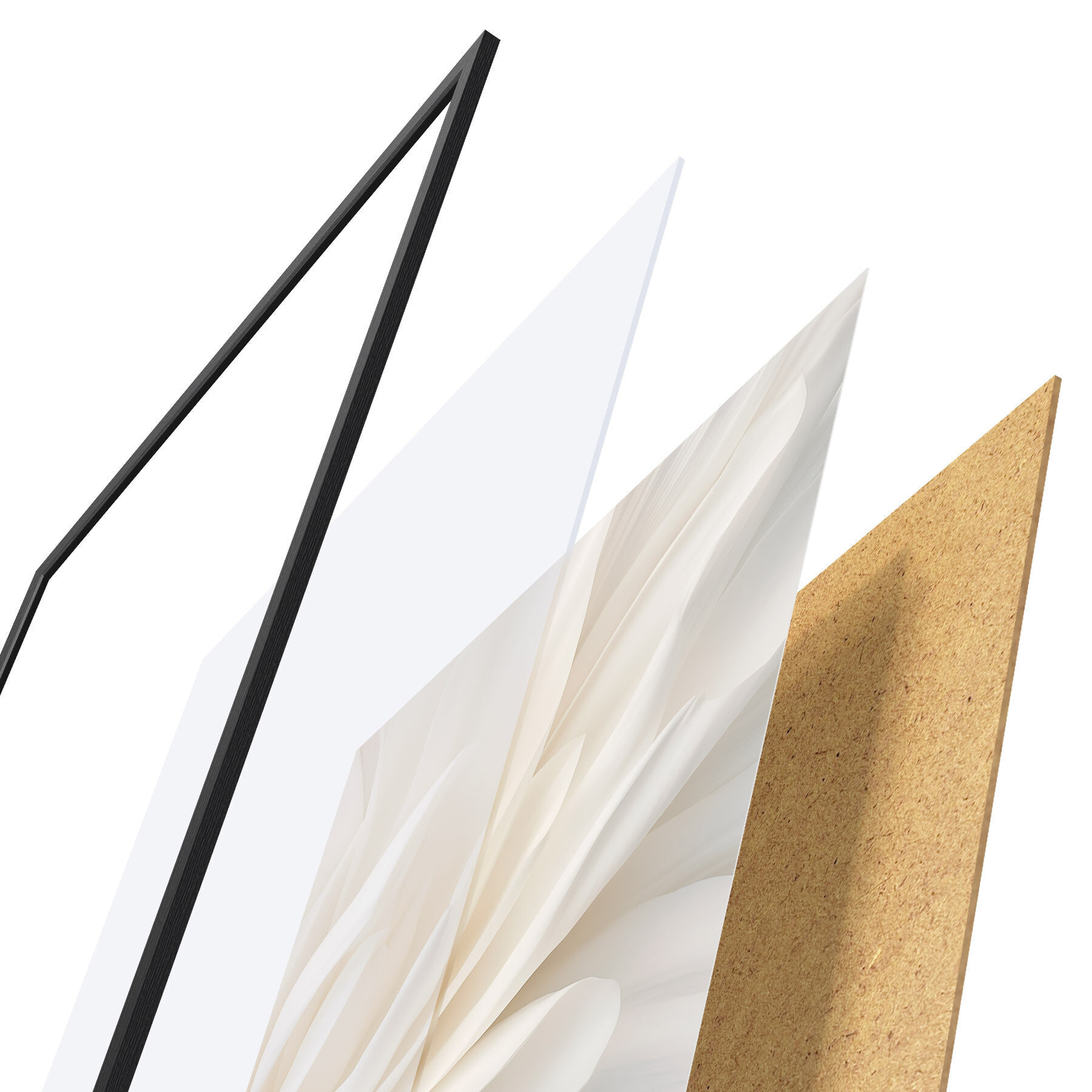 De poster bestaat uit een frame, plexiglas, geprinte afbeelding en spaanplaat achterkant. De poster kan meteen aan de muur worden gehangen dankzij de bevestigingen op de achterkant.