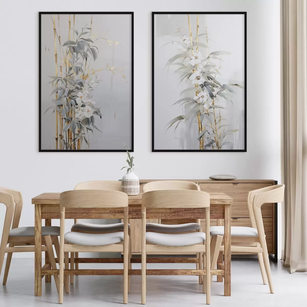 Poster Abstracte bamboestengels met gele accenten, delicate witte bloemen en lichtgroene bladeren, grijze achtergrond Nr d01127