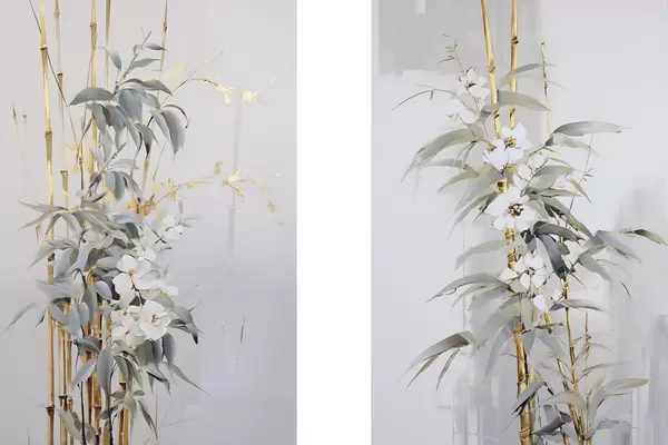 Poster Abstracte bamboestengels met gele accenten, delicate witte bloemen en lichtgroene bladeren, grijze achtergrond Nr d01127