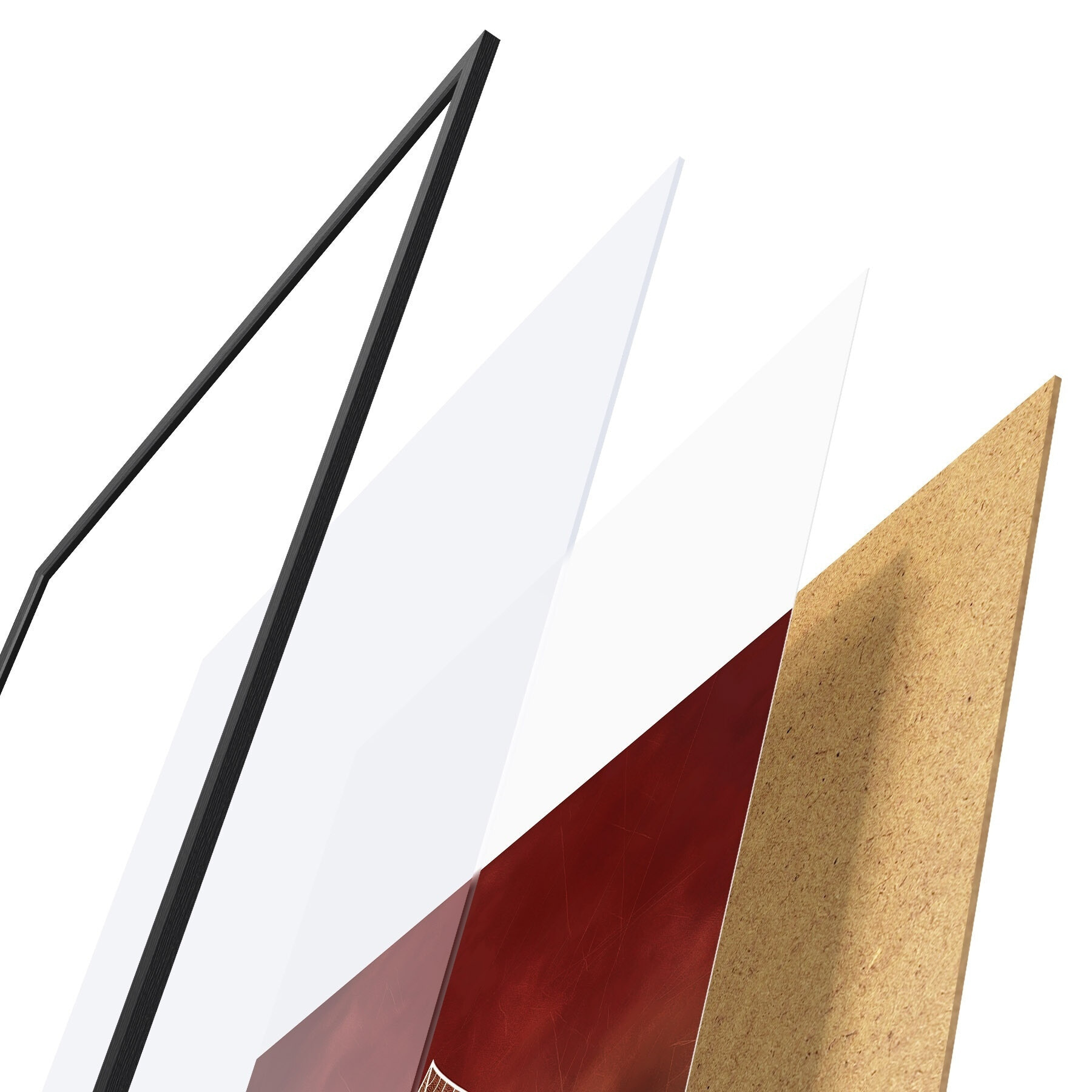 De poster bestaat uit een frame, plexiglas, geprinte afbeelding en spaanplaat achterkant. De poster kan meteen aan de muur worden gehangen dankzij de bevestigingen op de achterkant.