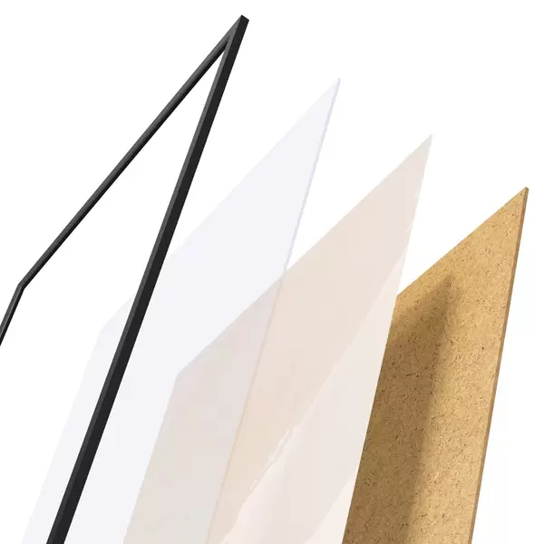 De poster bestaat uit een frame, plexiglas, geprinte afbeelding en spaanplaat achterkant. De poster kan meteen aan de muur worden gehangen dankzij de bevestigingen op de achterkant.