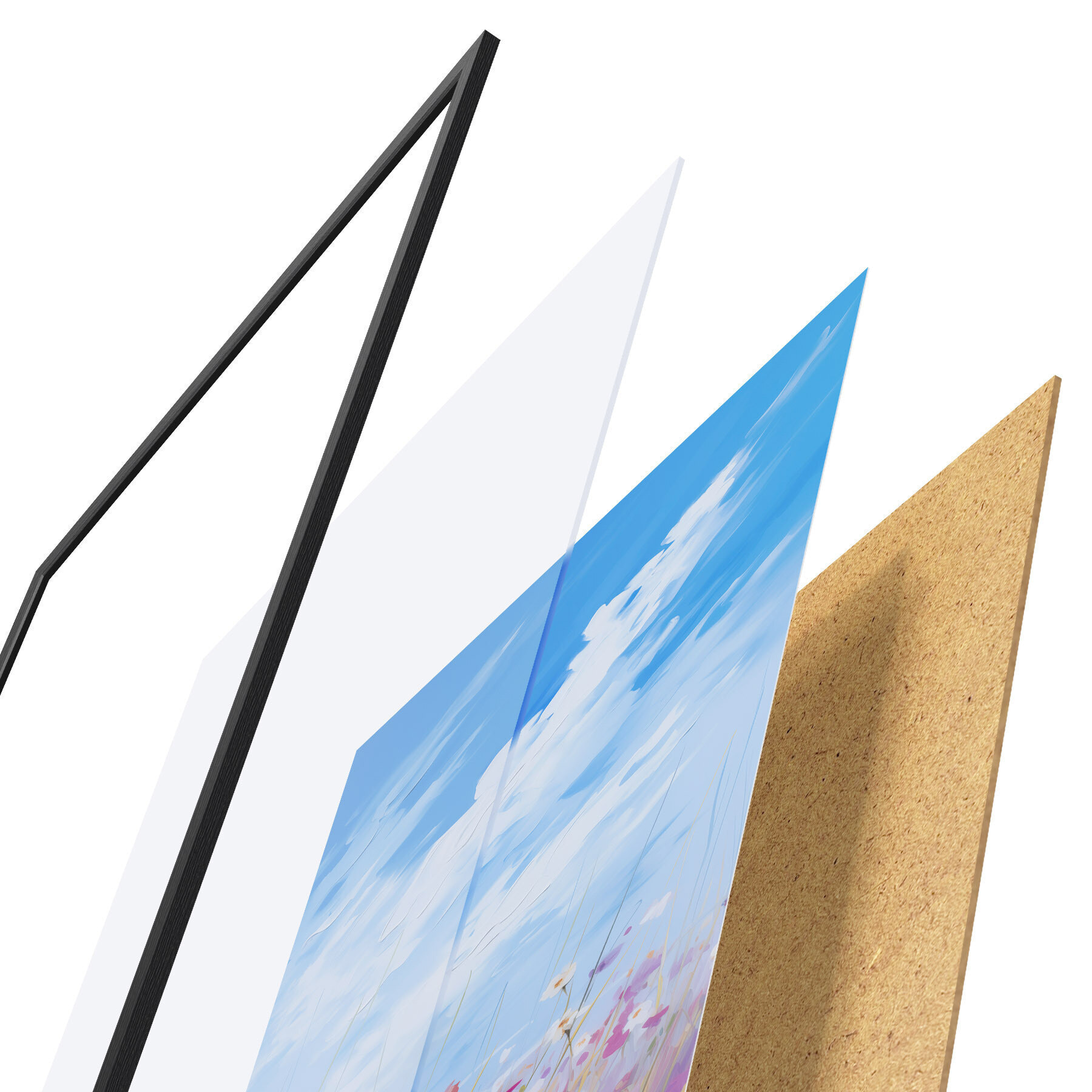 De poster bestaat uit een frame, plexiglas, geprinte afbeelding en spaanplaat achterkant. De poster kan meteen aan de muur worden gehangen dankzij de bevestigingen op de achterkant.