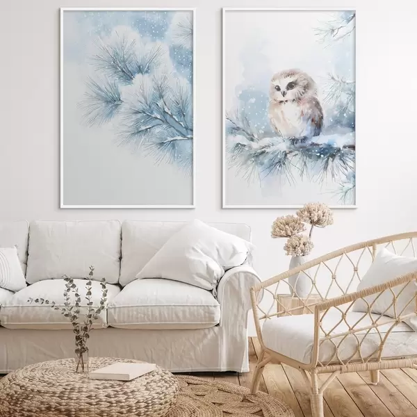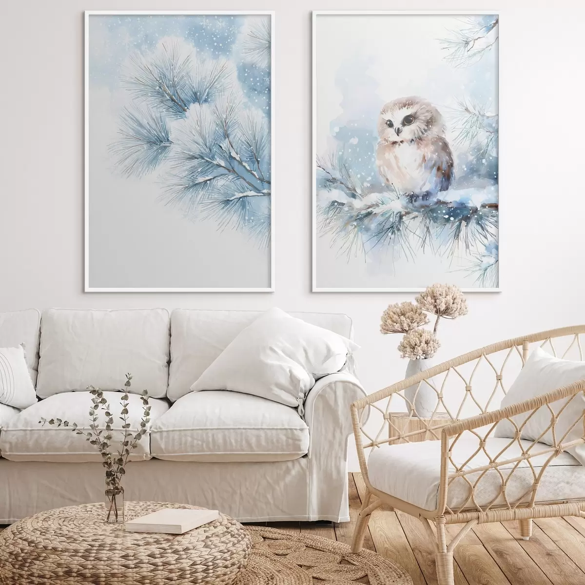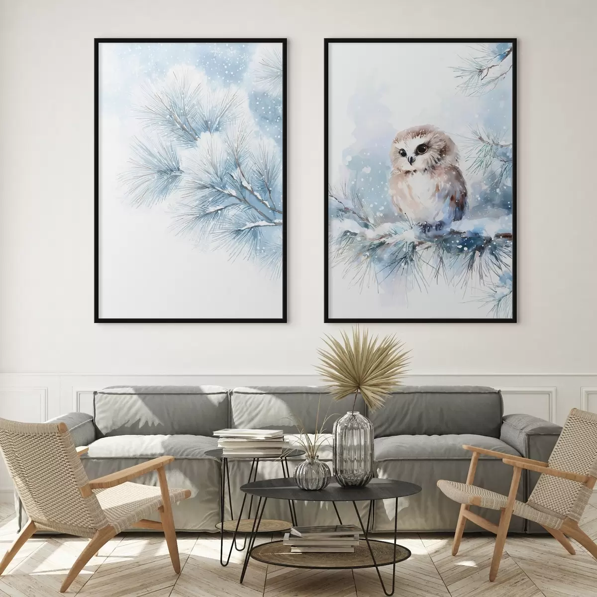 Poster schattige uil op een met sneeuw bedekte dennenboomtak in aquarelstijl Nr d01168