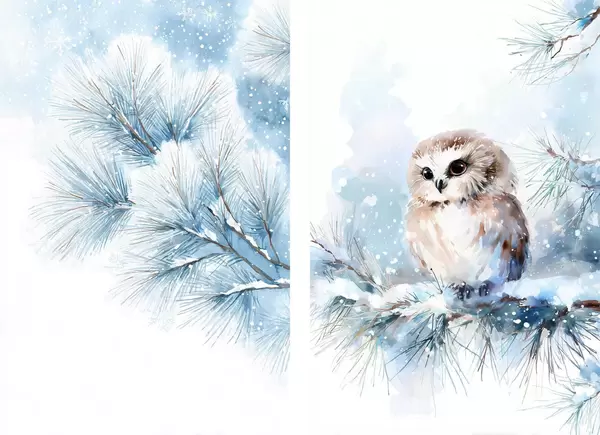 Poster schattige uil op een met sneeuw bedekte dennenboomtak in aquarelstijl Nr d01168