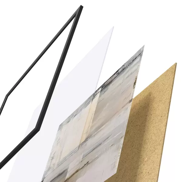 De poster bestaat uit een frame, plexiglas, geprinte afbeelding en spaanplaat achterkant. De poster kan meteen aan de muur worden gehangen dankzij de bevestigingen op de achterkant.