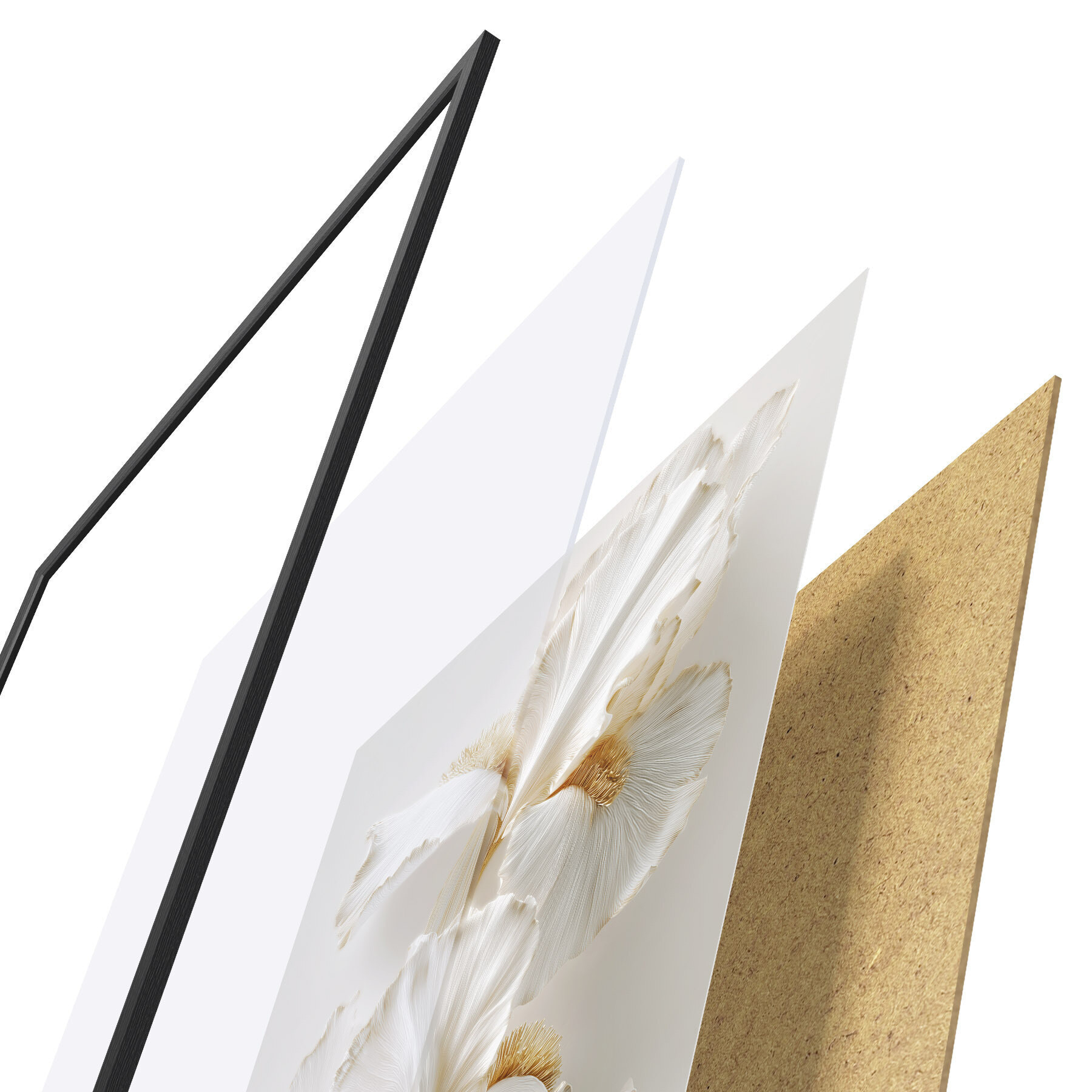 De poster bestaat uit een frame, plexiglas, geprinte afbeelding en spaanplaat achterkant. De poster kan meteen aan de muur worden gehangen dankzij de bevestigingen op de achterkant.