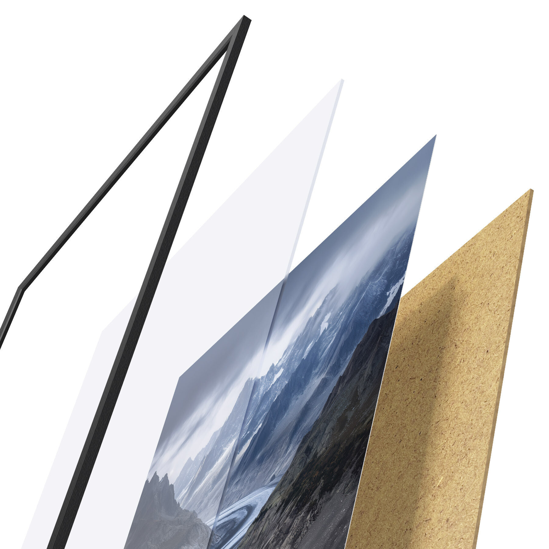 De poster bestaat uit een frame, plexiglas, geprinte afbeelding en spaanplaat achterkant. De poster kan meteen aan de muur worden gehangen dankzij de bevestigingen op de achterkant.