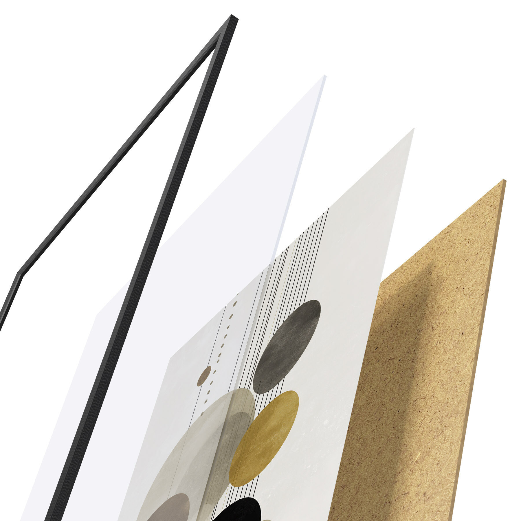 De poster bestaat uit een frame, plexiglas, geprinte afbeelding en spaanplaat achterkant. De poster kan meteen aan de muur worden gehangen dankzij de bevestigingen op de achterkant.