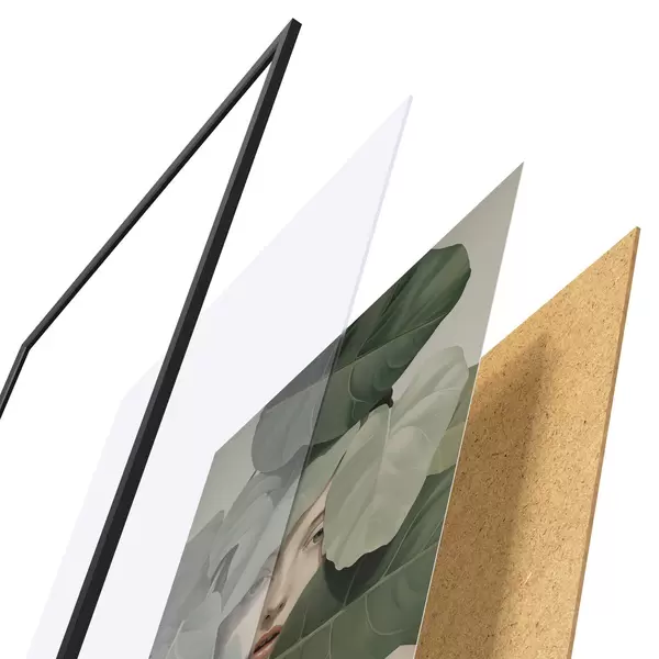De poster bestaat uit een frame, plexiglas, geprinte afbeelding en spaanplaat achterkant. De poster kan meteen aan de muur worden gehangen dankzij de bevestigingen op de achterkant.