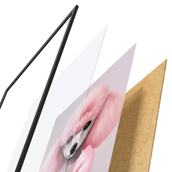 De poster bestaat uit een frame, plexiglas, geprinte afbeelding en spaanplaat achterkant. De poster kan meteen aan de muur worden gehangen dankzij de bevestigingen op de achterkant.