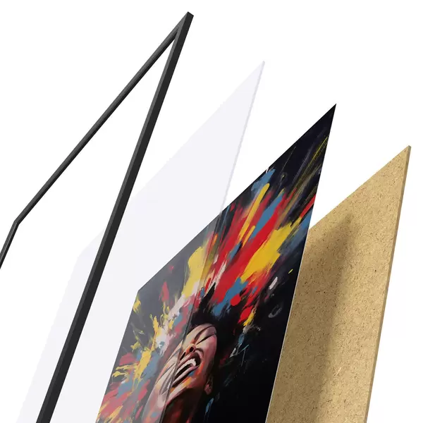 De poster bestaat uit een frame, plexiglas, geprinte afbeelding en spaanplaat achterkant. De poster kan meteen aan de muur worden gehangen dankzij de bevestigingen op de achterkant.