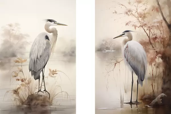 Poster Een reiger staat op een rots in een meer met hoog gras en bomen op de achtergrond. Nr d01239