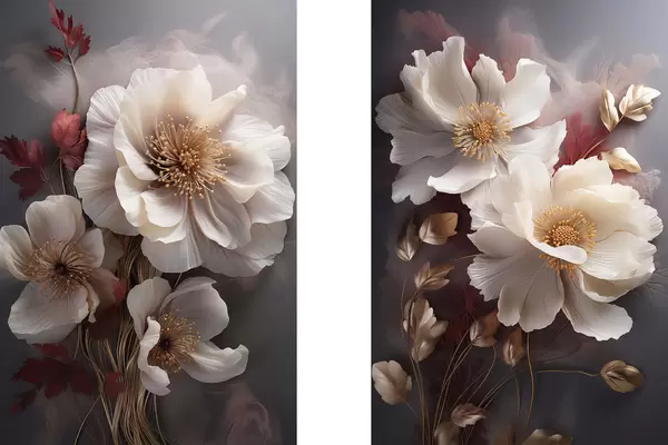 Poster Delicate pioenrozen met dunne, ijle bloemblaadjes, omgeven door donkerrode en gele bladeren tegen een abstracte achtergrond Nr d01243