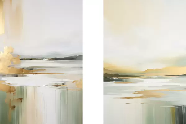 Poster Abstract landschap met gele en groene tinten, water dat de lucht en verre bergen weerspiegelt, bleke, wazige lucht Nr d01245