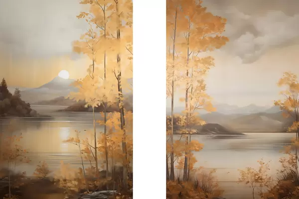 Poster Herfstbomen met oranje bladeren omlijsten een rustig meer met bergen in de verte onder een bewolkte hemel. Nr d01246