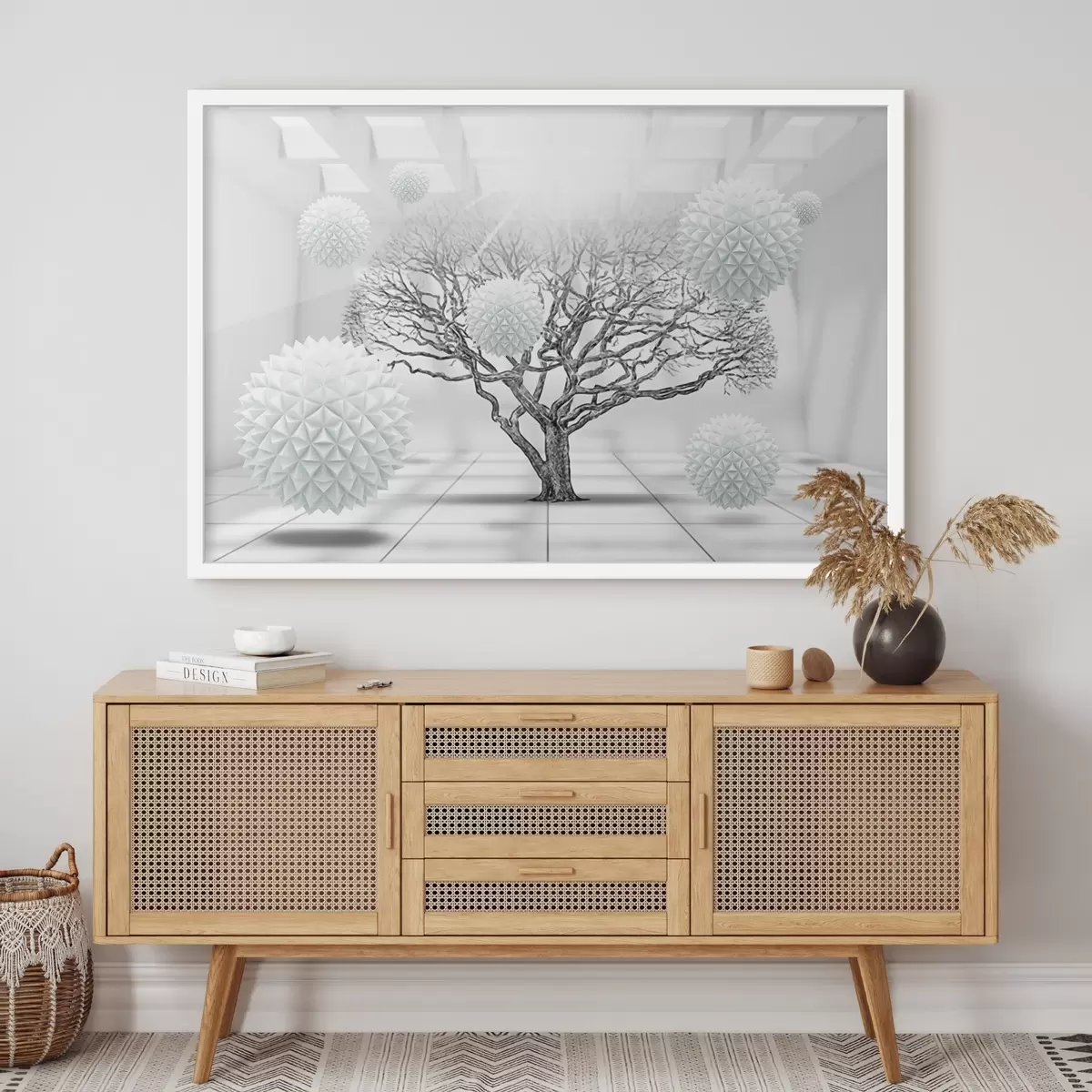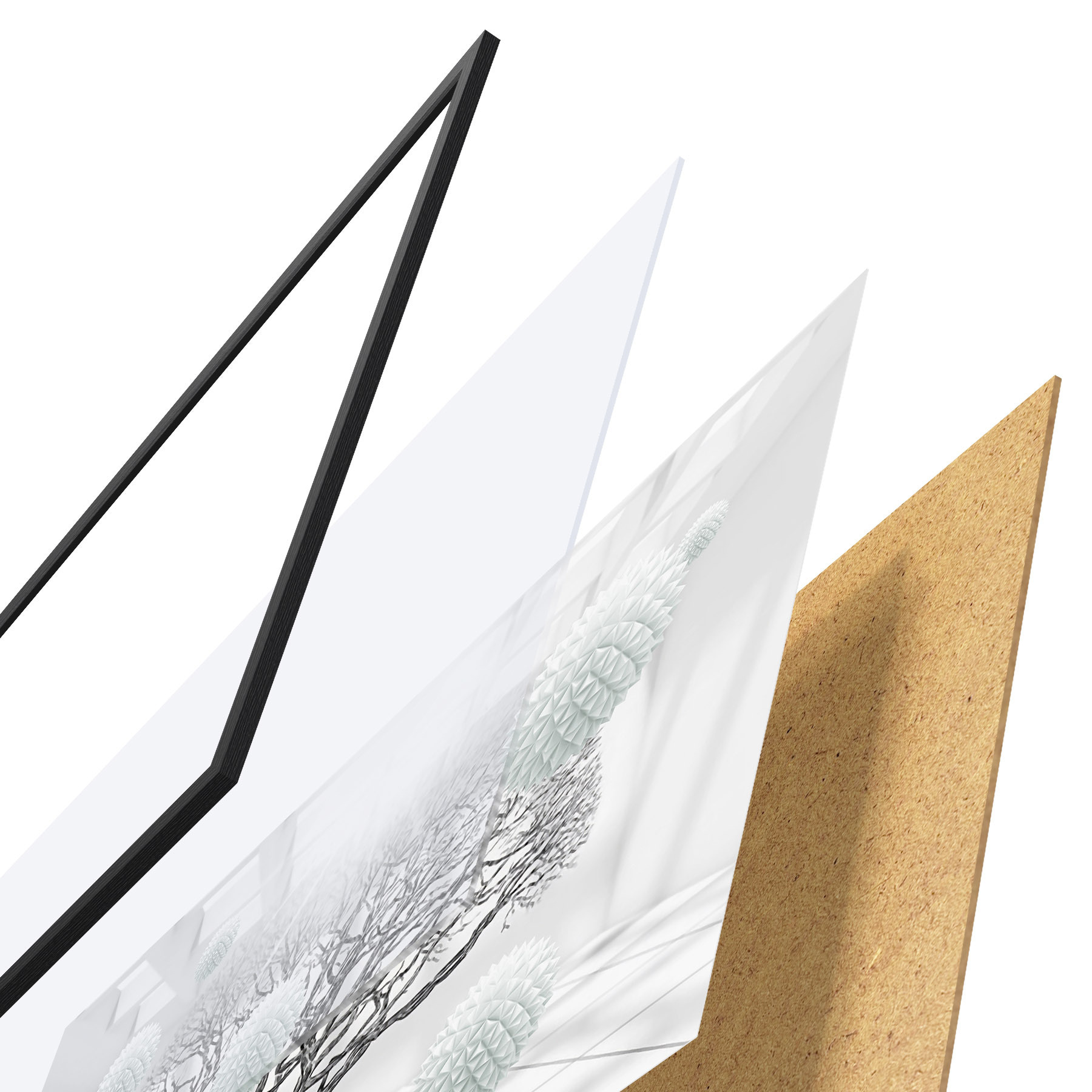 De poster bestaat uit een frame, plexiglas, geprinte afbeelding en spaanplaat achterkant. De poster kan meteen aan de muur worden gehangen dankzij de bevestigingen op de achterkant.