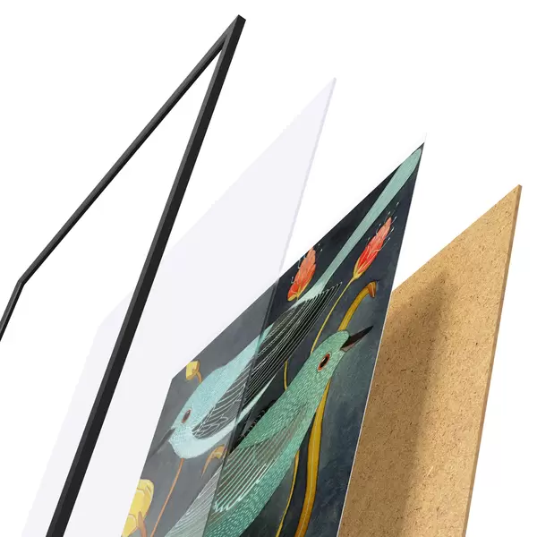 De poster bestaat uit een frame, plexiglas, geprinte afbeelding en spaanplaat achterkant. De poster kan meteen aan de muur worden gehangen dankzij de bevestigingen op de achterkant.