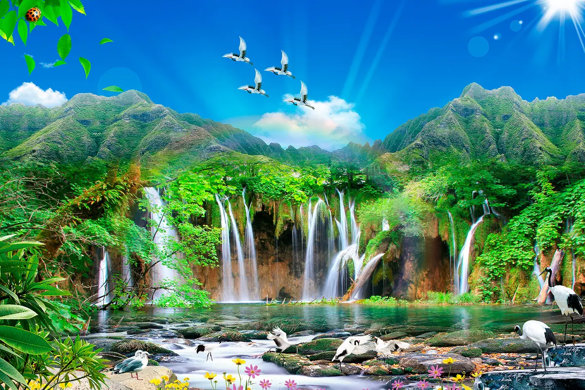 Poster Sereen lentelandschap met vredige dieren in het wild f03428