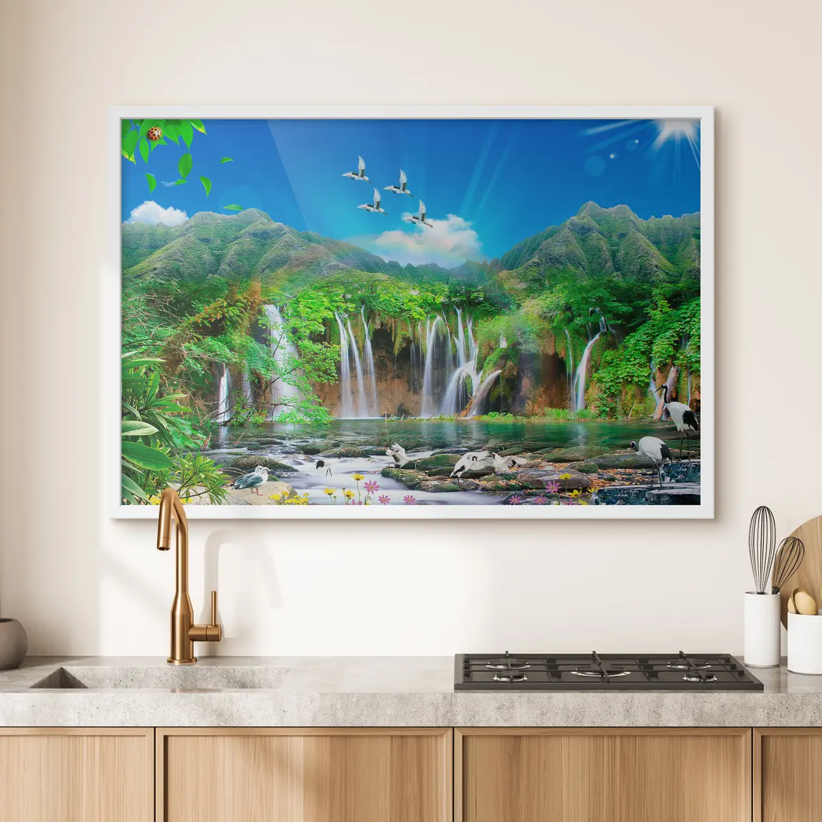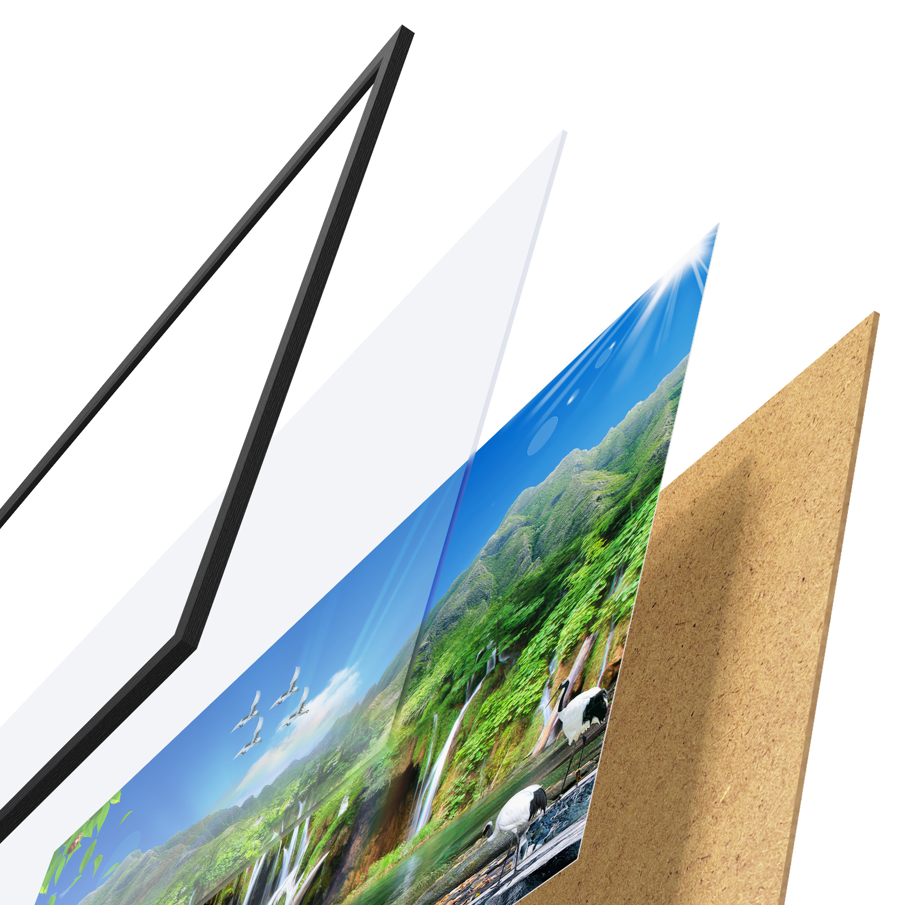 De poster bestaat uit een frame, plexiglas, geprinte afbeelding en spaanplaat achterkant. De poster kan meteen aan de muur worden gehangen dankzij de bevestigingen op de achterkant.
