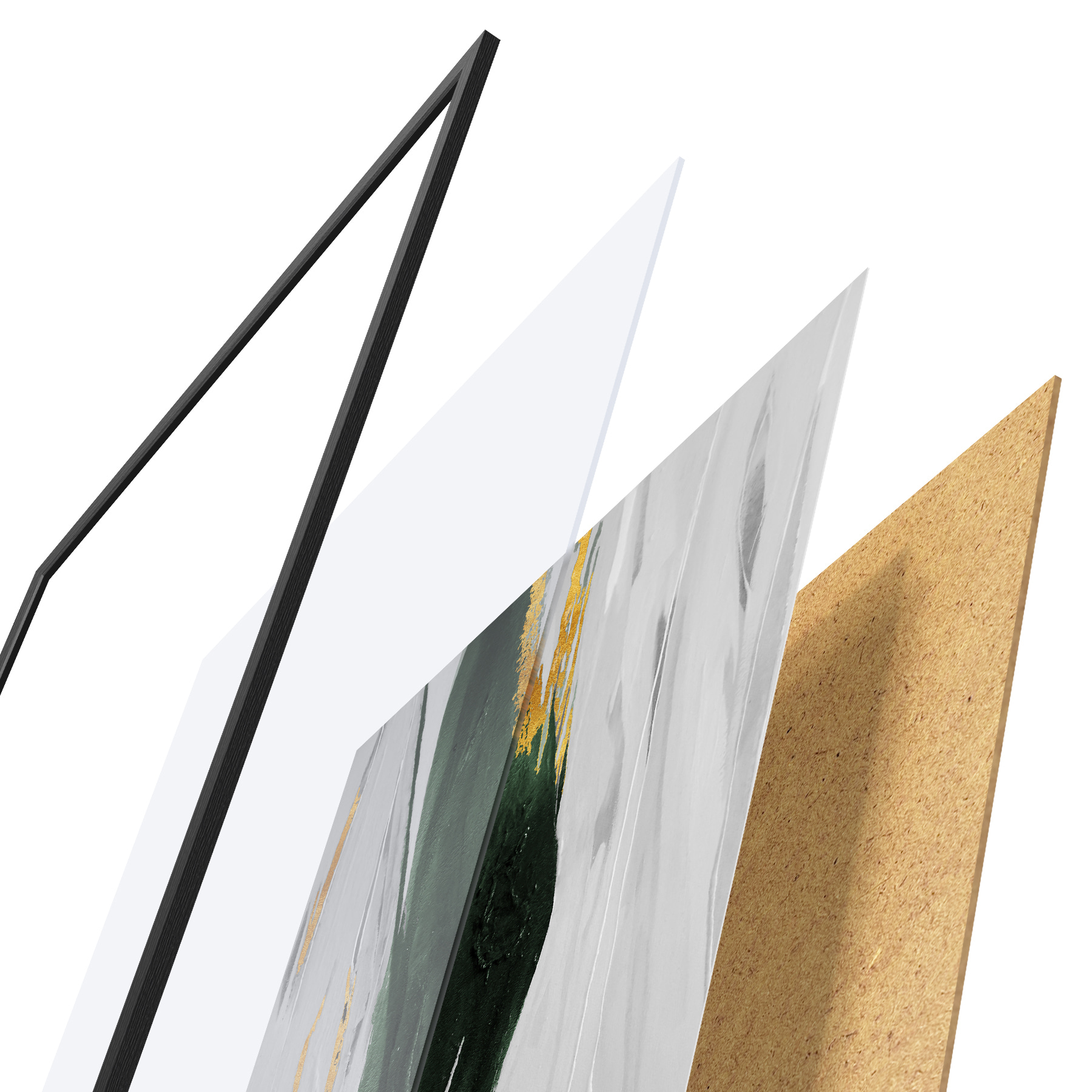 De poster bestaat uit een frame, plexiglas, geprinte afbeelding en spaanplaat achterkant. De poster kan meteen aan de muur worden gehangen dankzij de bevestigingen op de achterkant.