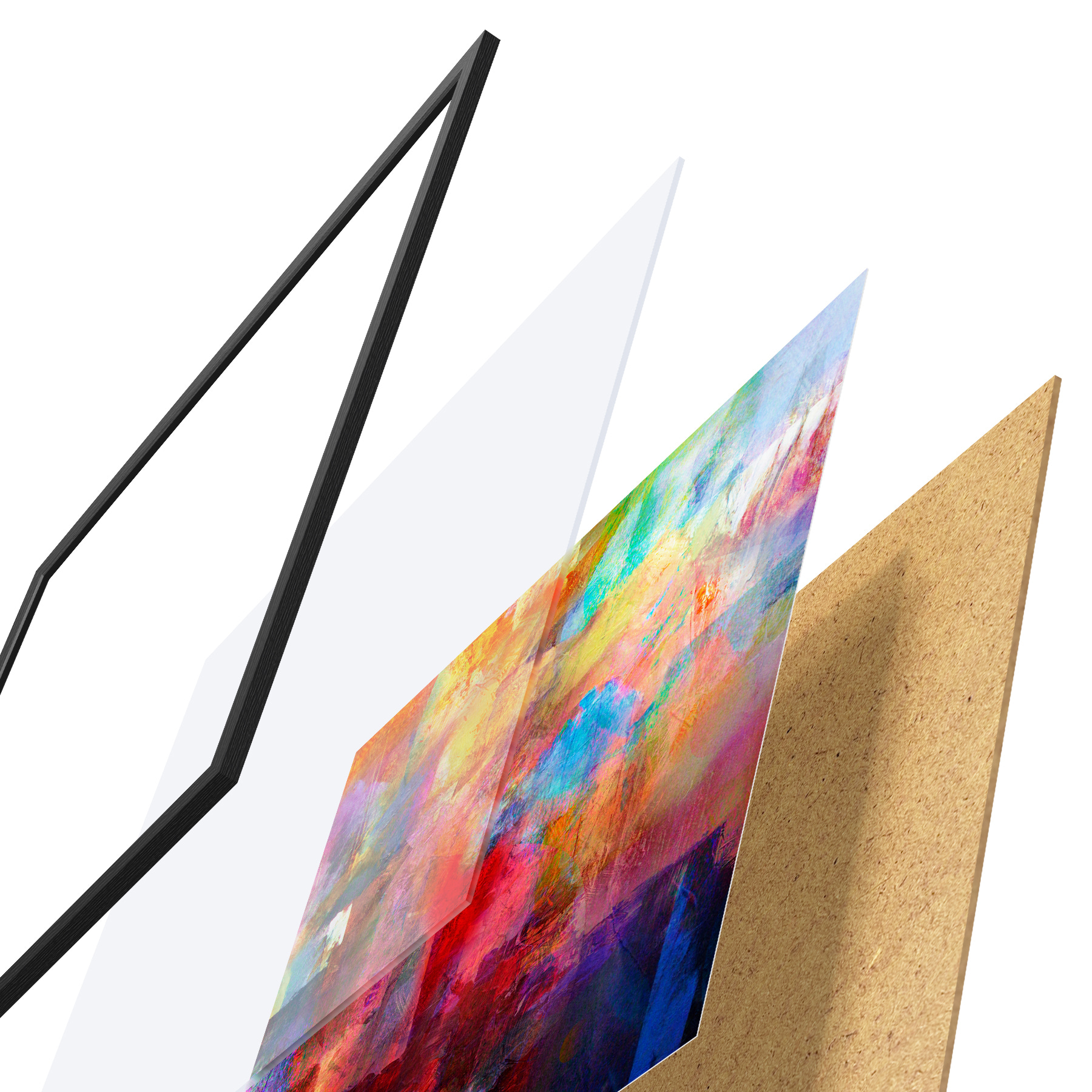 De poster bestaat uit een frame, plexiglas, geprinte afbeelding en spaanplaat achterkant. De poster kan meteen aan de muur worden gehangen dankzij de bevestigingen op de achterkant.