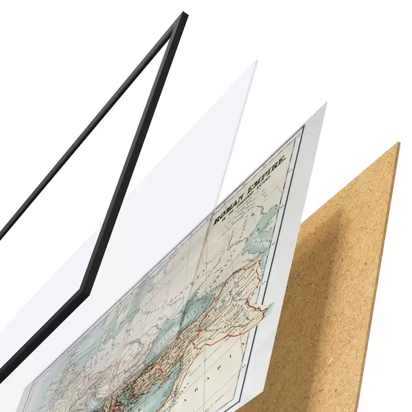 De poster bestaat uit een frame, plexiglas, geprinte afbeelding en spaanplaat achterkant. De poster kan meteen aan de muur worden gehangen dankzij de bevestigingen op de achterkant.