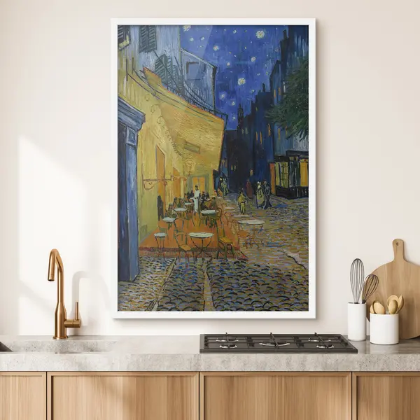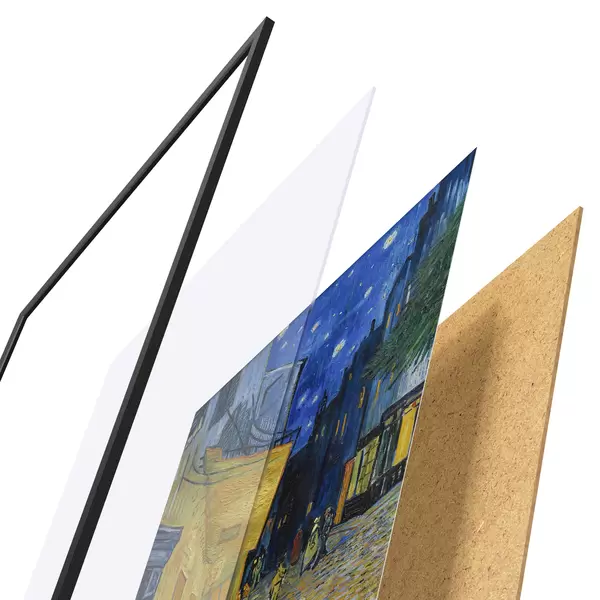 De poster bestaat uit een frame, plexiglas, geprinte afbeelding en spaanplaat achterkant. De poster kan meteen aan de muur worden gehangen dankzij de bevestigingen op de achterkant.