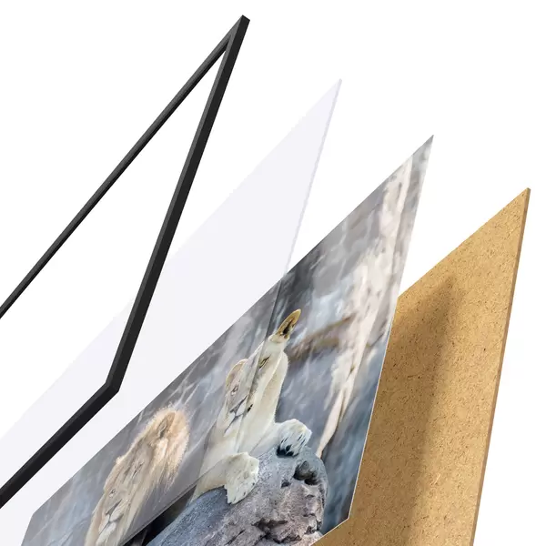 De poster bestaat uit een frame, plexiglas, geprinte afbeelding en spaanplaat achterkant. De poster kan meteen aan de muur worden gehangen dankzij de bevestigingen op de achterkant.