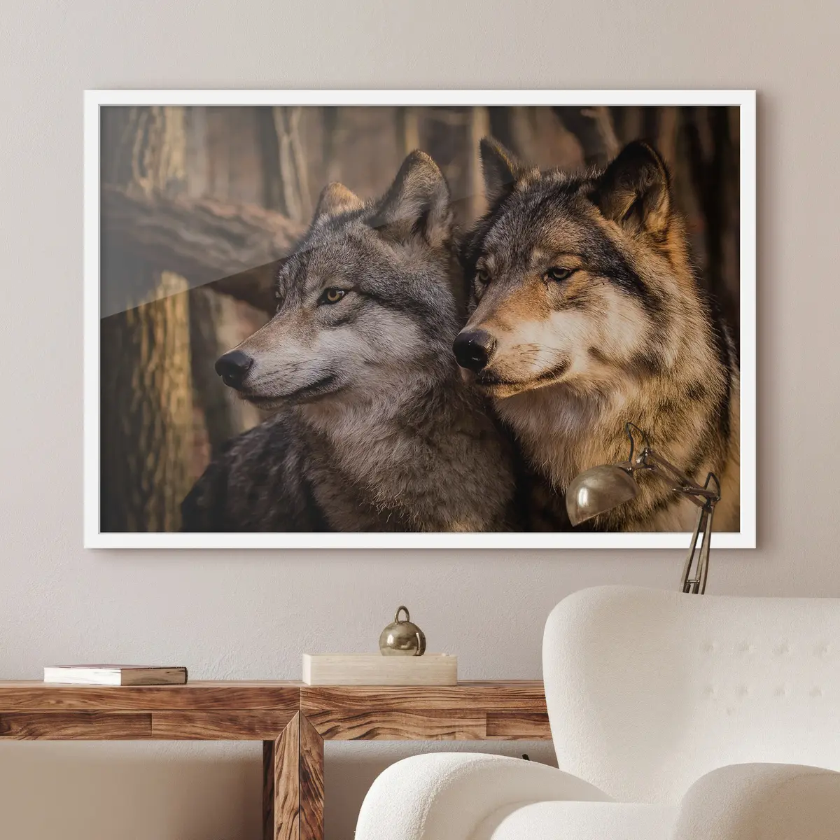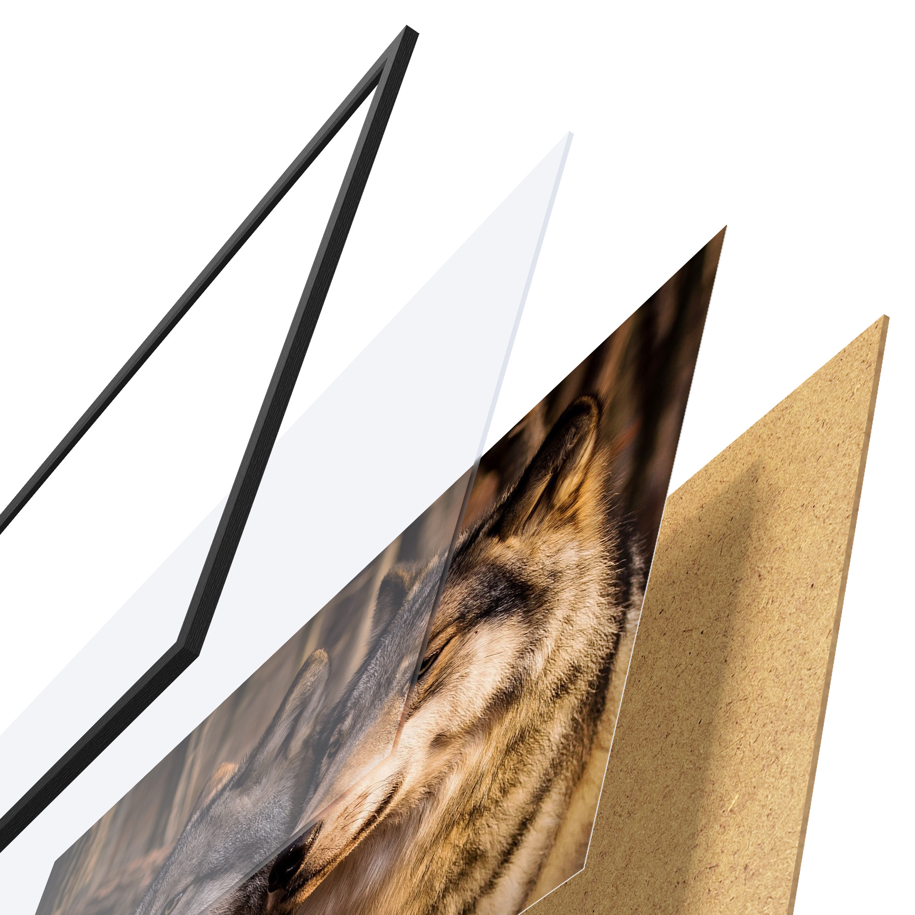 De poster bestaat uit een frame, plexiglas, geprinte afbeelding en spaanplaat achterkant. De poster kan meteen aan de muur worden gehangen dankzij de bevestigingen op de achterkant.