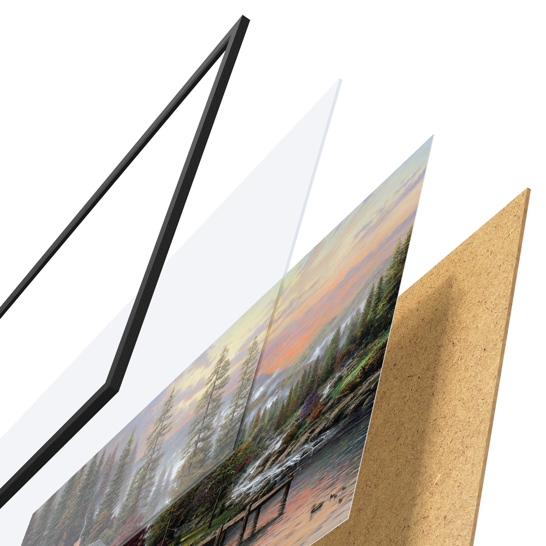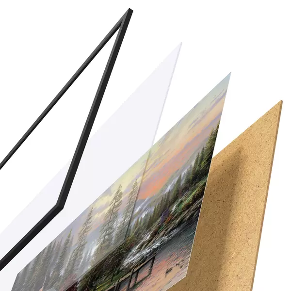 De poster bestaat uit een frame, plexiglas, geprinte afbeelding en spaanplaat achterkant. De poster kan meteen aan de muur worden gehangen dankzij de bevestigingen op de achterkant.