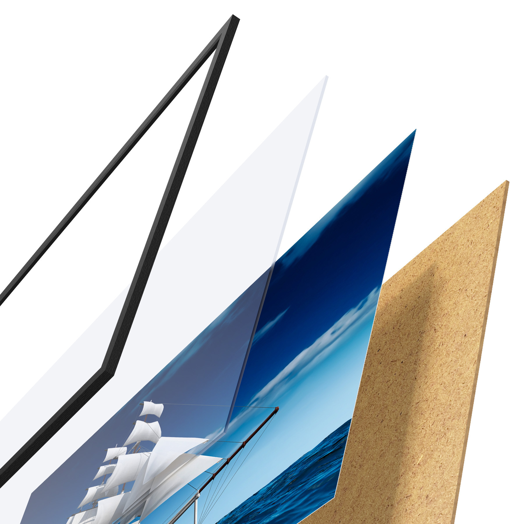 De poster bestaat uit een frame, plexiglas, geprinte afbeelding en spaanplaat achterkant. De poster kan meteen aan de muur worden gehangen dankzij de bevestigingen op de achterkant.
