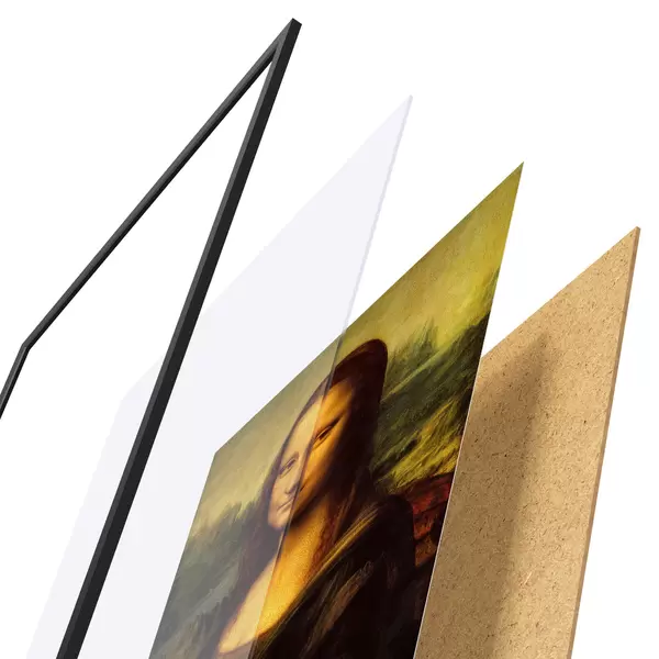 De poster bestaat uit een frame, plexiglas, geprinte afbeelding en spaanplaat achterkant. De poster kan meteen aan de muur worden gehangen dankzij de bevestigingen op de achterkant.