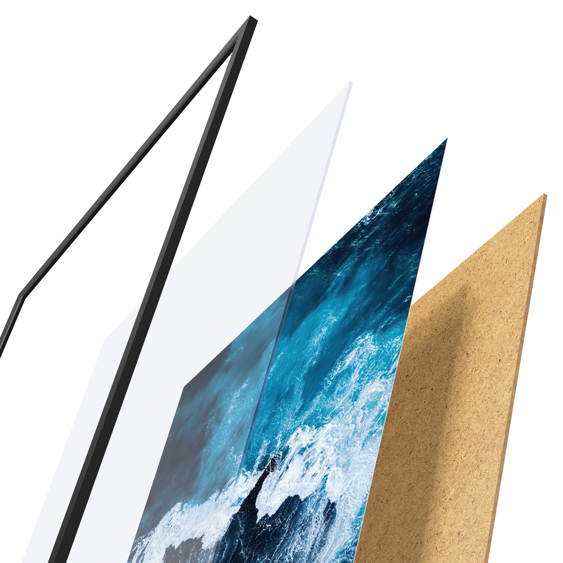 De poster bestaat uit een frame, plexiglas, geprinte afbeelding en spaanplaat achterkant. De poster kan meteen aan de muur worden gehangen dankzij de bevestigingen op de achterkant.