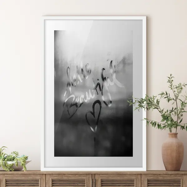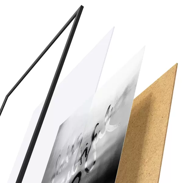 De poster bestaat uit een frame, plexiglas, geprinte afbeelding en spaanplaat achterkant. De poster kan meteen aan de muur worden gehangen dankzij de bevestigingen op de achterkant.