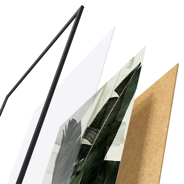 De poster bestaat uit een frame, plexiglas, geprinte afbeelding en spaanplaat achterkant. De poster kan meteen aan de muur worden gehangen dankzij de bevestigingen op de achterkant.