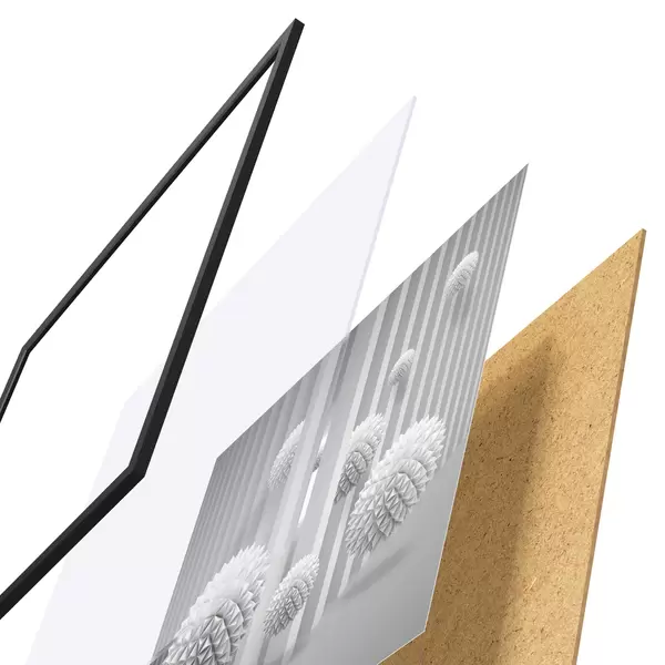 De poster bestaat uit een frame, plexiglas, geprinte afbeelding en spaanplaat achterkant. De poster kan meteen aan de muur worden gehangen dankzij de bevestigingen op de achterkant.