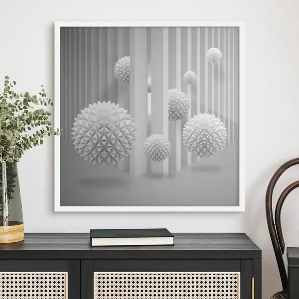 De poster bestaat uit een frame, plexiglas, geprinte afbeelding en spaanplaat achterkant. De poster kan meteen aan de muur worden gehangen dankzij de bevestigingen op de achterkant.